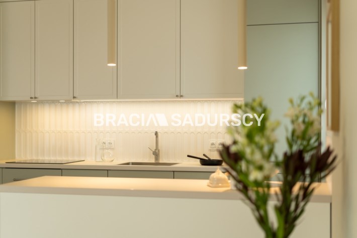W salonie jest wygodna kanapa, szafka telewizyjna, witryna na porcelanę,  stół oraz krzesła. Przestronna kuchnia z dodatkową wyspą zapewnia komfortową przestrzeń do gotowania i magazynowania. Jest wyposażona w cały niezbędny sprzęt AGD tj. płyta indukcyjna, piekarnik, zmywarka, lodówka oraz okap. Mieszkanie z klimatyzacją.