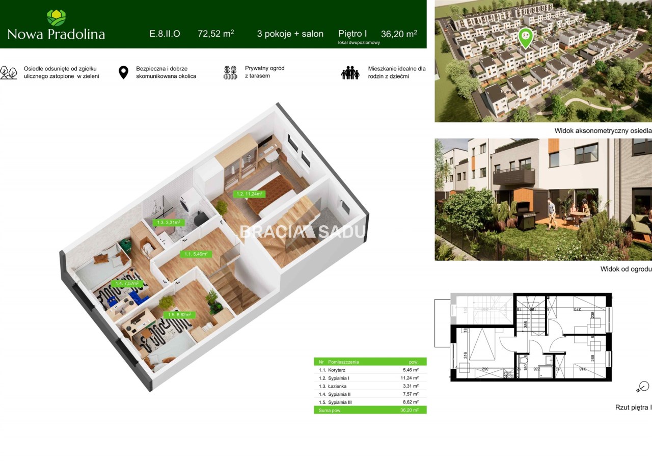 Prezentowane mieszkanie to przestronne, 2 poziomowe, 4 pokojowe mieszkanie na parterze i 1 piętrze o pow. 72,52 m2 z ogródkiem o pow. 35,90 m2. Na poziomie parteru znajduje się salon z aneksem kuchennym o pow. 25,62 m2, łazienka (4,05 m2) oraz wiatrołap i przedpokój. W ogródku komórka narzędziowa. Na 1 piętrze znajdują się 3 pokoje (11,24 m2; 8,62 m2 i 7,57 m2), łazienka (3,31 m2) oraz przedpokój.